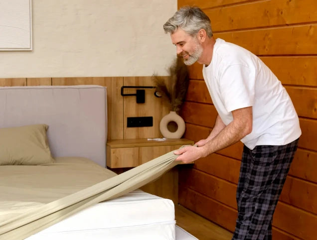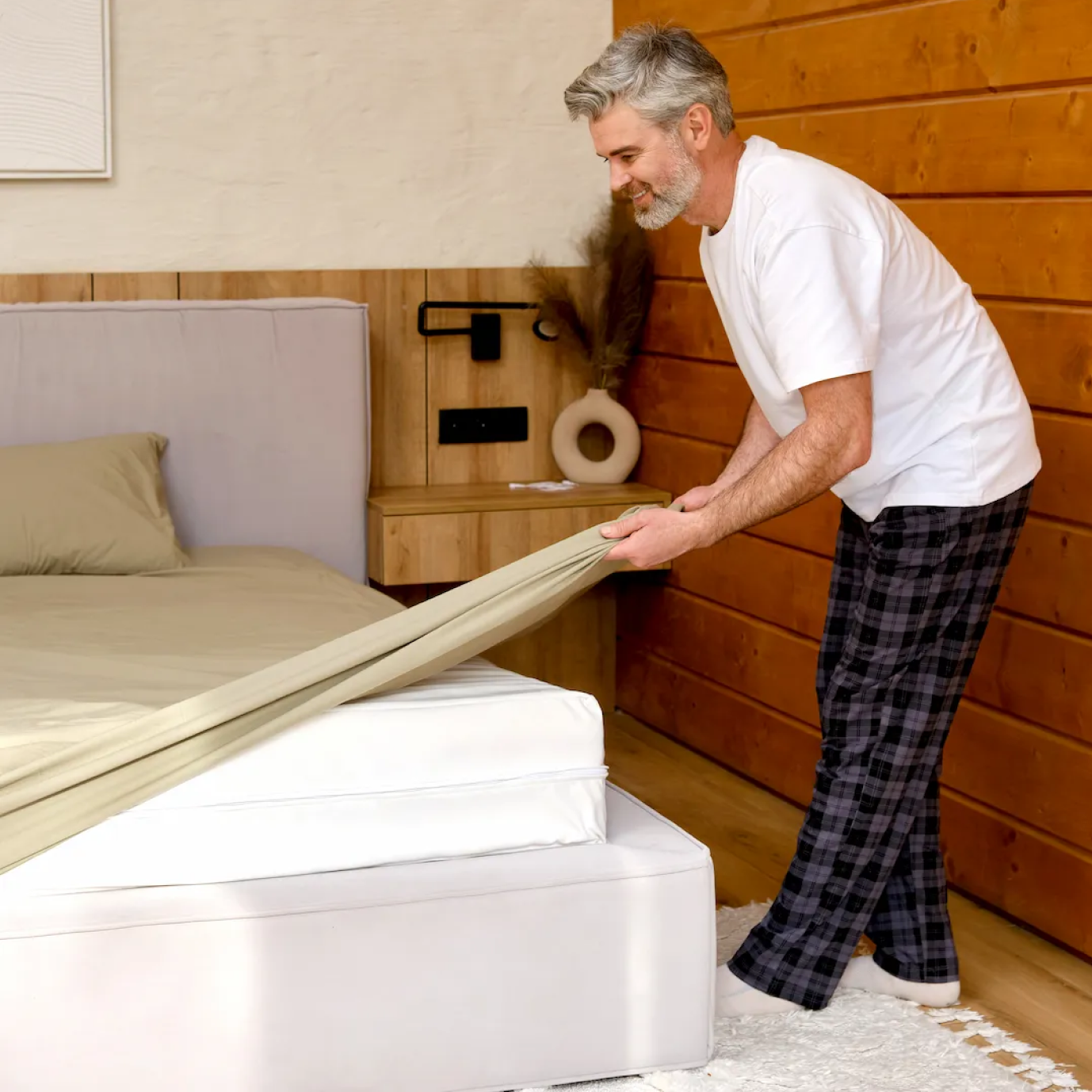 Wasche dein Sheet am besten wöchentlich oder mindestens zweimal im Monat. Nutze warmes Wasser (ca. 40 °C) in der Waschmaschine. Trockne es an der Luft oder im Trockner bei niedriger Temperatur. Bügle es nur, wenn nötig, ebenfalls auf niedriger Stufe. Und: Warte nach dem Auftragen von Lotionen oder Körperölen etwa eine Stunde, bevor du das Sheet berührst.